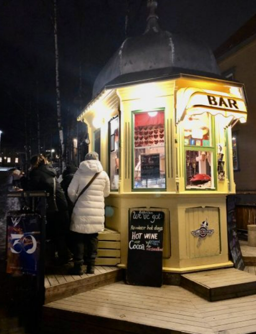 1911년에 문을 연 노르웨이에서 가장 작은 바입니다. 이 노란 벽과 양파 머리가 특징이며, 처음 열렸을 때는 "양파 키오스크"라고 불렸습니다. 오늘날 이곳은 트롬쇠의 가장 상징적인 만남의 장소로 알려져 있으며 "로켓"으로도 알려져 있습니다.