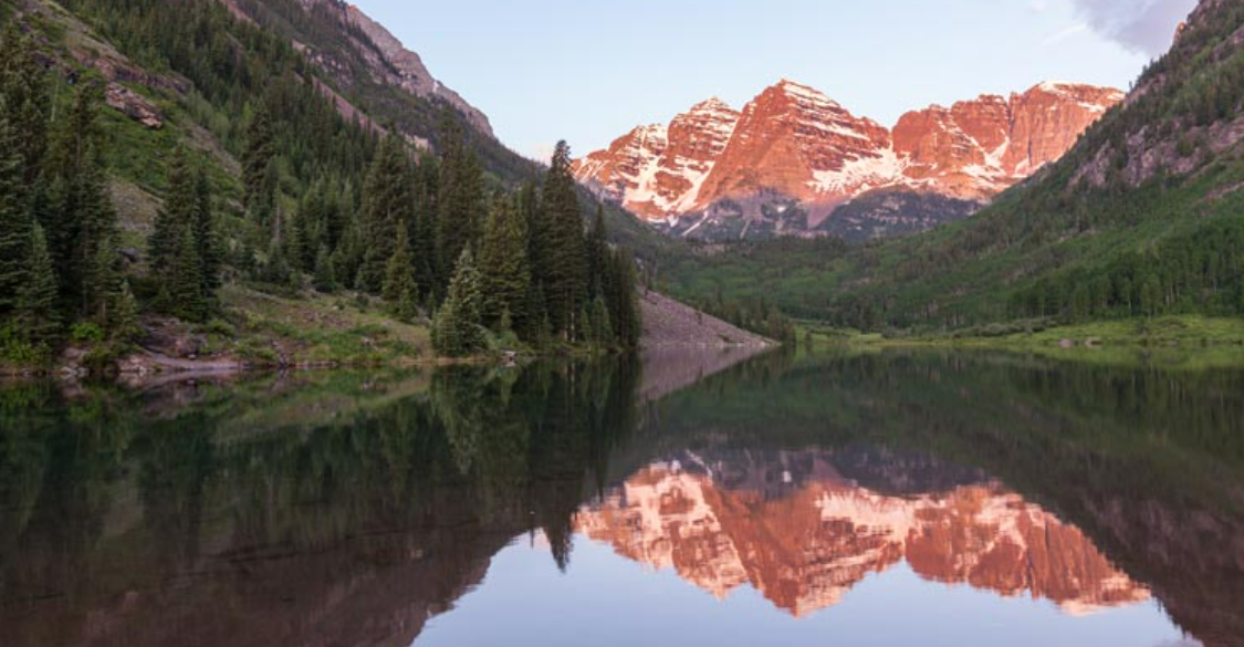 마룬 호수(Maroon Lake)와 마룬 벨(Maroon Bells)은 콜로라도 로키 산맥의 가장 상징적인 전망입니다. 여름에는 야생화가 만개하여 관광객들에게 인기가 있습니다. 아침이나 낮 등 시간대에 따라 호수에 비친 산은 다른 표정을 보여줍니다.