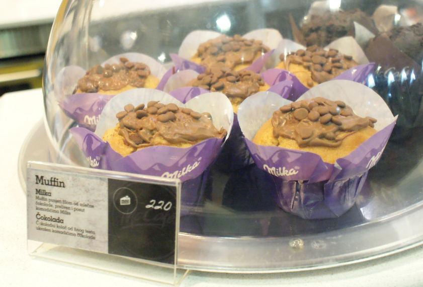 밀카 콜라보레이션의 머핀(220디나르). 보라색 포장지는 알프스의 산을 디자인하고 그 위에 쫄깃쫄깃한 맛의 밀크 초콜릿의 진한 맛을 얹었습니다. 모두 안에 초콜릿이 들어 있어 단 것을 좋아하는 사람에게는 견딜 수 없는 맛 입니다