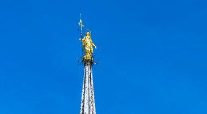 중앙에 있는 첨탑 위에는 황금 마리아상이 있습니다. 밤에는 조명이 켜지지만, 더 가까이서 보고 싶은 경우에는 옥상으로 올라가시면, 첨탑들을 보다 가까이서 감상할 수 있을 뿐만 아니라 밀라노 시내도 함께 조망할 수 있어 아름다운 경치를 즐길 수 있습니다.
