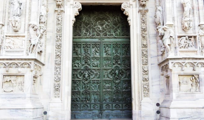 두오모 정면에는 5개의 큰 문이 있습니다. 청동 대문으로 가운데 대문에는 성모 마리아의 생애가 그려져 있습니다.