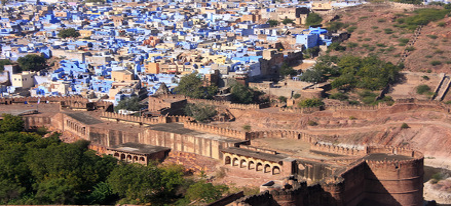 It's a huge citadel on a rocky mountain in Rajasthan, North India, built by the royal family who ruled it in the 15th century. From the walls, you can enjoy the streets and spectacular views of Jodvr, which are a mixture of towering palaces and blue buildings under the snow.